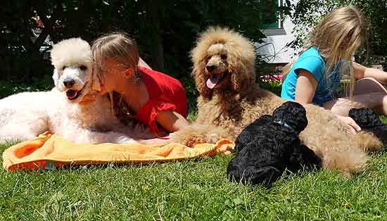 Kein Wunder, dass die kleinen Lockenmaden schon so groß sind, der dicke Franz sogar das schwerste Pudelkönigsbaby aller Zeiten ist - haben sie doch acht Zitzen zu viert! Pausenlos umsorgt sie zudem Mutti, schleckt und leckt, wärmt und schwärmt für ihre süßen Fellnasen. Nachdem die letzten Fäden nun gezogen sind, ist Rotkäppchen wieder ganz die "Alte", hat die Strapazen erstaunlich gut weggesteckt und genießt unbeschwert jeden Moment mit ihrem Nachwuchs.